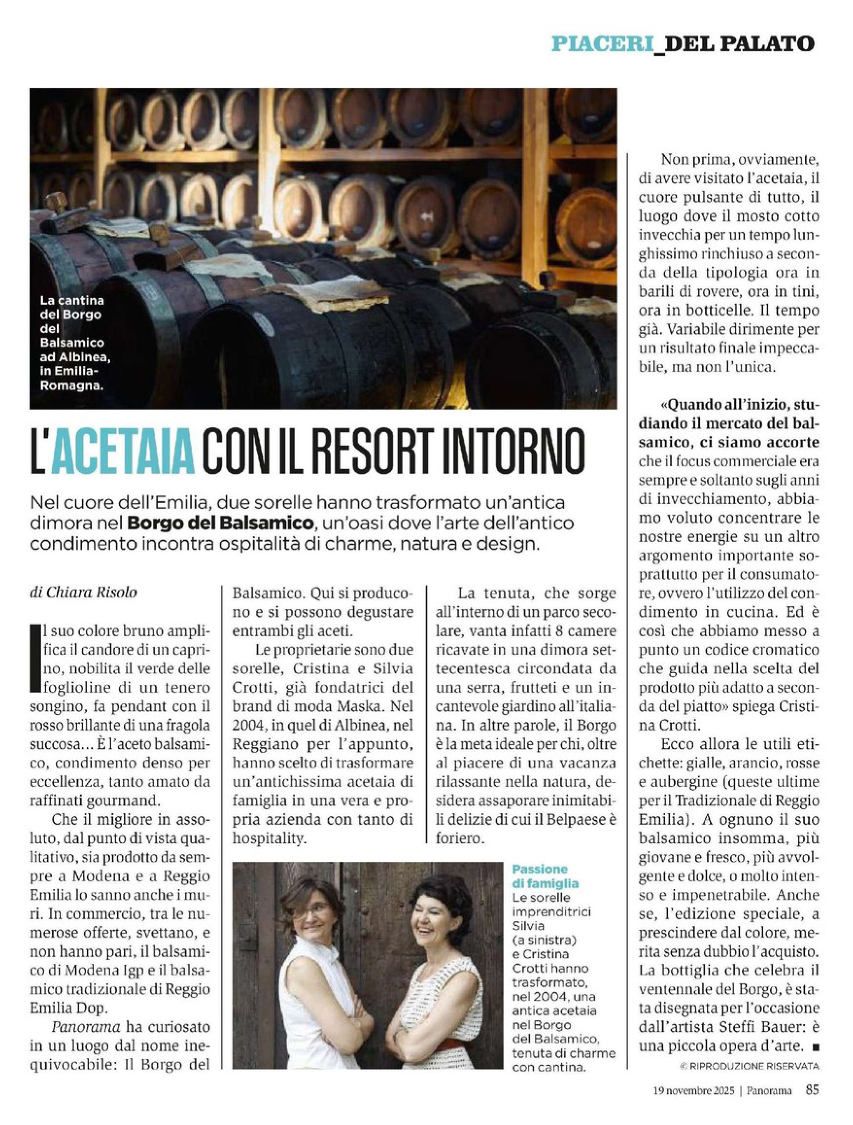 Panorama also reports on the cultural and gastronomic value of real balsamic vinegar, prodotto simbolo di Modena e Reggio Emilia, soffermandosi sull’approccio innovativo del Borgo, che ha introdotto un codice cromatico delle etichette per guidare il consumatore nell’utilizzo corretto del condimento in cucina, valorizzandone non solo l’invecchiamento ma anche la sua funzione gastronomica.