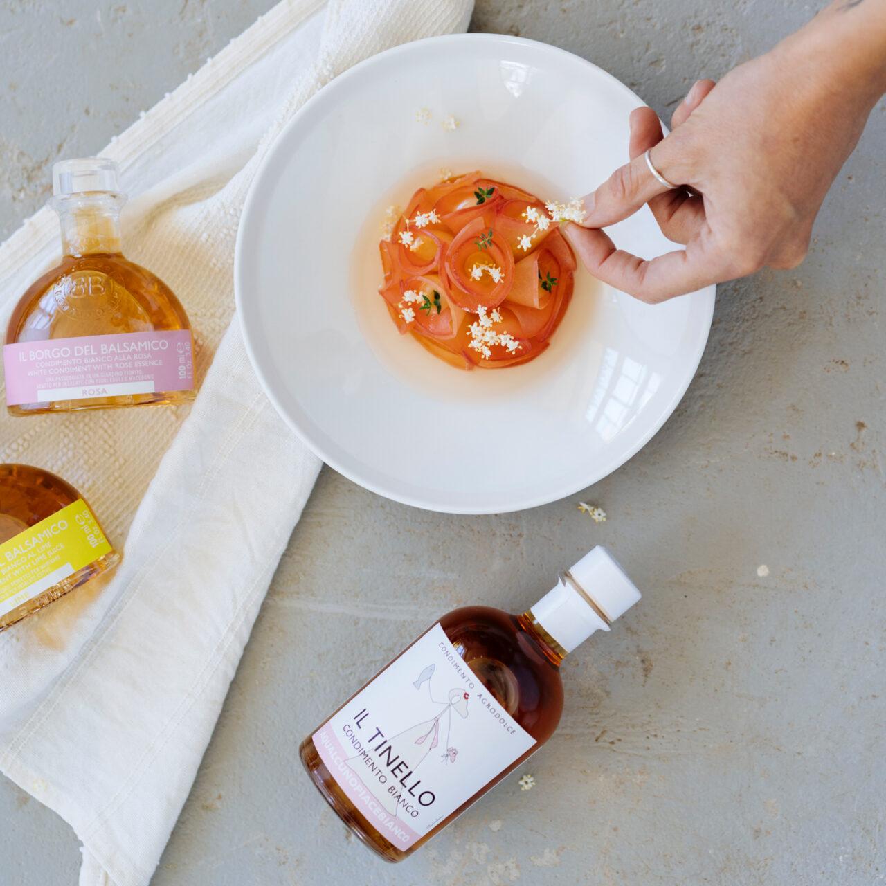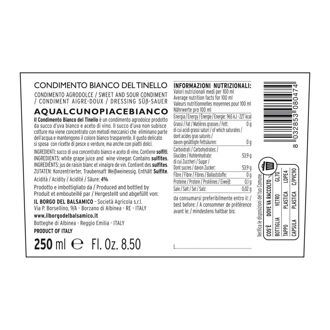Il Condimento Bianco del Tinello è un Condimento Agrodolce prodotto da succo d’uva bianco e aceto di vino. Il succo d’uva non subisce cotture ma viene concentrato con metodi meccanici che eliminano parte dell’acqua e mantengono il colore bianco trasparente.