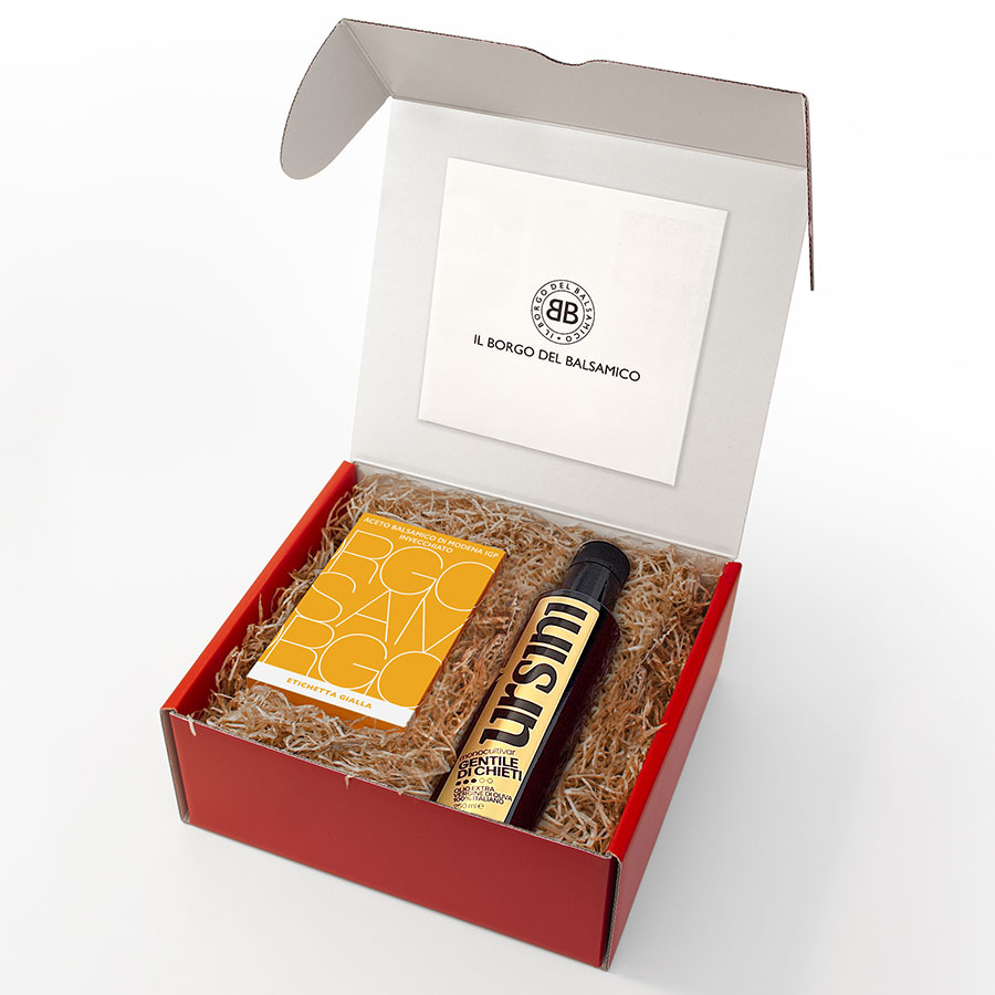 Confezione Il Rosso Va su tutto Aceto Balsamico di Modena Invecchiato e Olio EVO Gentile di Chieti