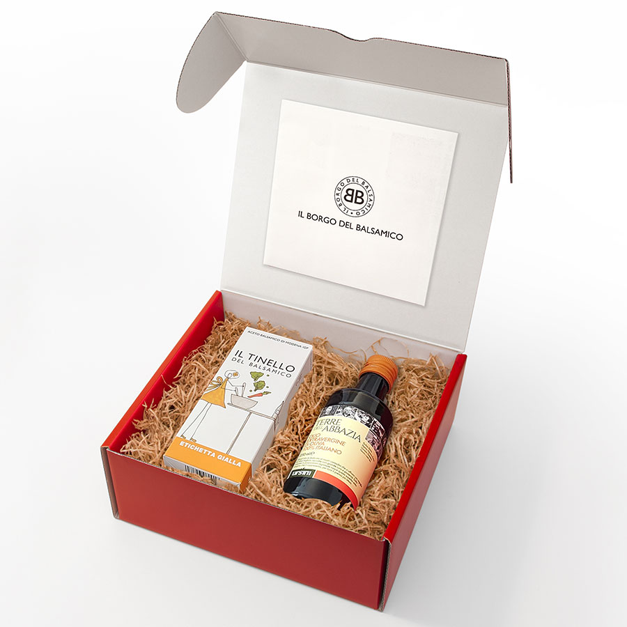 Un regalo facile e amatissimo, la combinazione EVO e balsamico : il Nostro amatissimo Tinello etichetta gialla per le insalate di tutti i giorni e l’Olio Extra Vergine d’Oliva Terre dell’Abbazia.